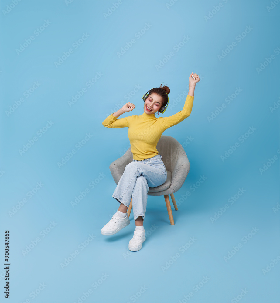 Happy young asian girl listening music with headphone dancing on chair isolated on blue background. People lifestyle concept