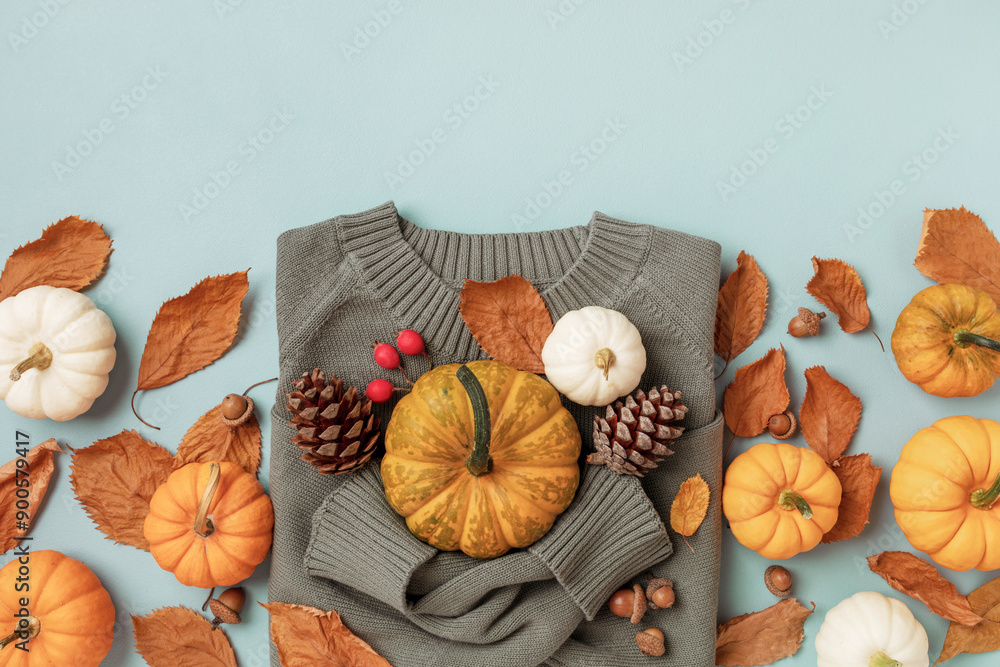 Autumn Thanksgiving holiday background from knitted sweater with pumpkins harvest, dried leaves foliage, pinecones and fall decorations top view..