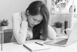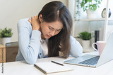 Body muscles stiff problem, ache asian young woman, girl pain neck while sitting work on chair at home, holding massaging rubbing, hurt or sore, Healthcare people, office syndrome.