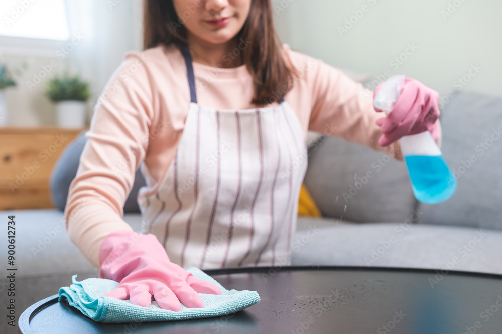 Cleanliness asian young woman working chore cleaning on table at home, hand wearing glove using rag rub remove dust with spray bottle. Household hygiene clean up, cleaner, equipment tool for cleaning