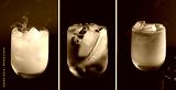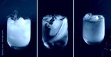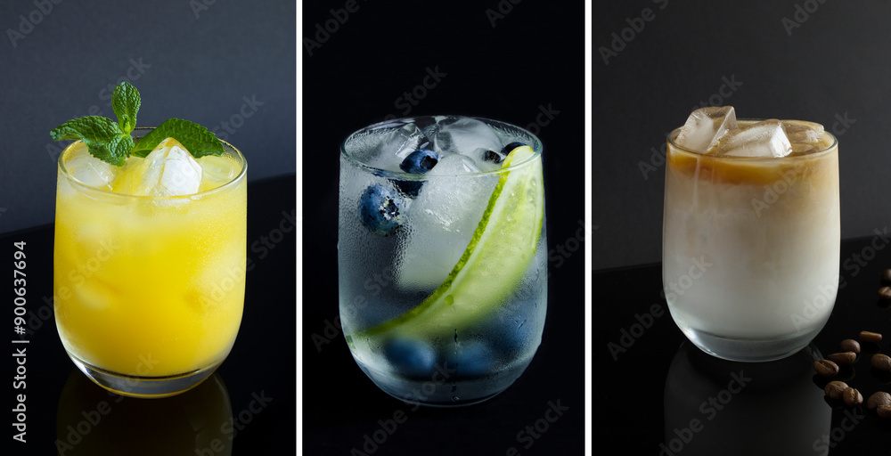 Collage of summer cold drink. Orange juice, infused water with cucumber and blueberry, cold brew coffee with milk on the black background.