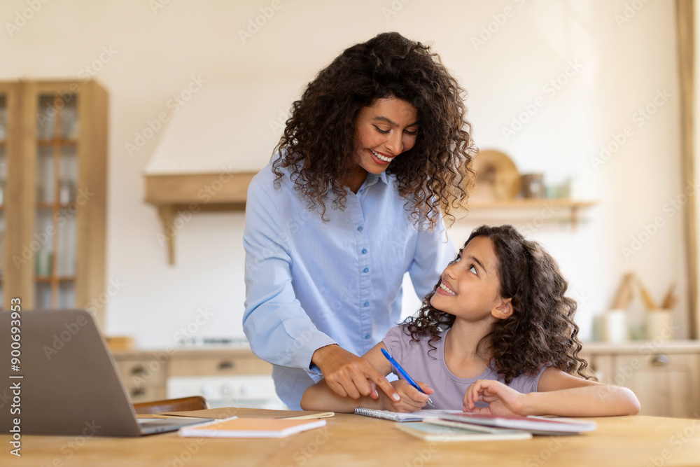 Loving mother helping her daughter with study, family doing homework together, sitting at table in kitchen interior