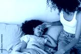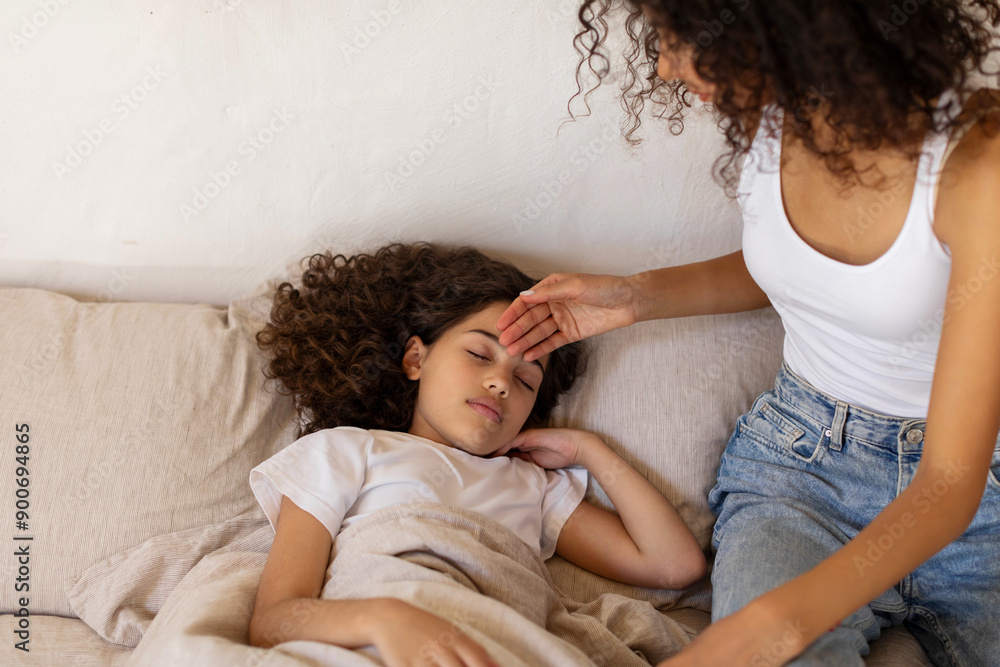 Worried mother checking her sick daughter body temperature, touching her forehead, home interior. Ill girl feeling bad, got cold or fever