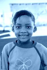 village portrait of a single african girl with braids having a big toothy smile standing in front of the house
