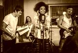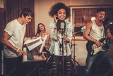 Multiracial music band performing in a recording studio