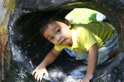 Asian boy about two years old wear a yellow shirt, was playing with a toy.