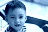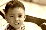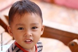 Asian boy about two years old wearing striped shirt sitting happily smiling in a chair.