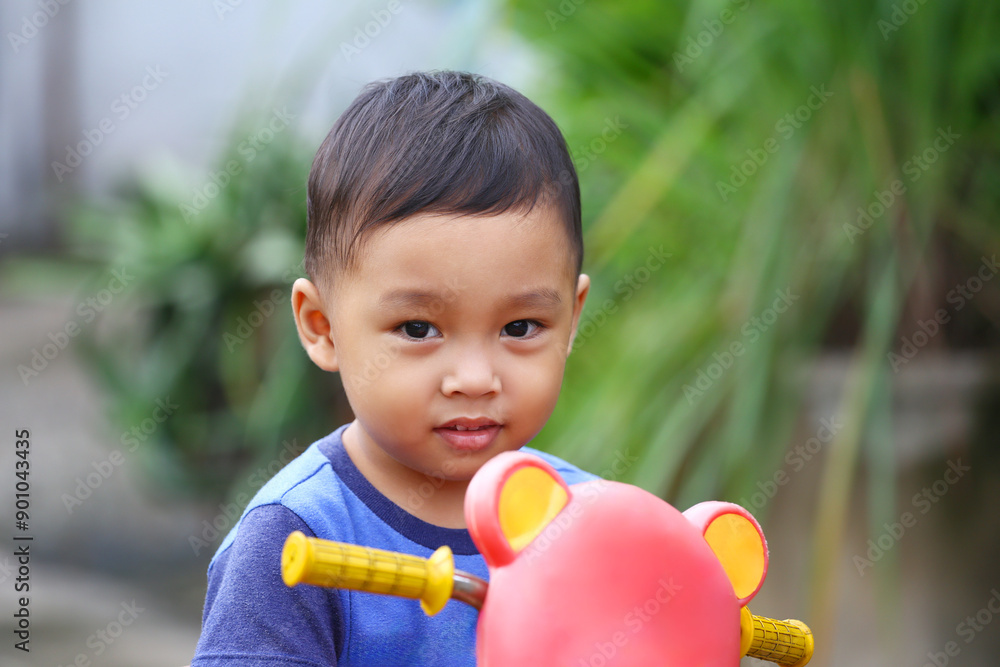 Asian boy about two years old wear a blue shirt was sitting on his toy car.
