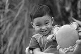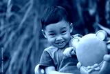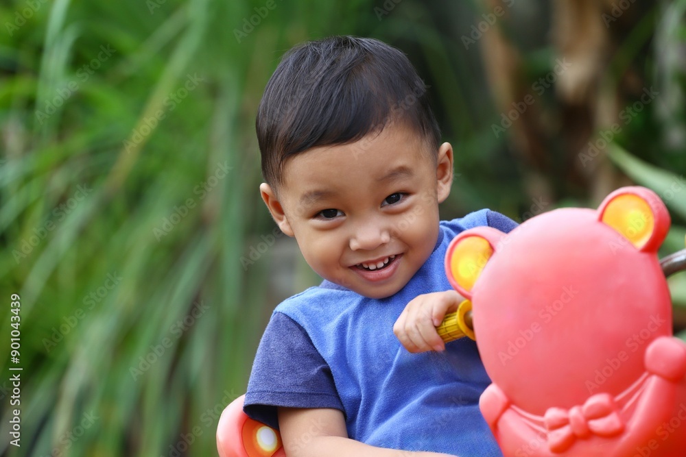 Asian boy about two years old wear a blue shirt was sitting on his toy car.