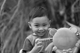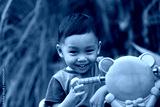 Asian boy about two years old wear a blue shirt was sitting on his toy car.