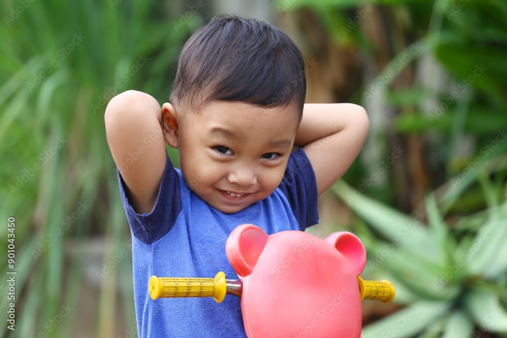 Asian boy about two years old wear a blue shirt was sitting on his toy car.