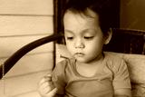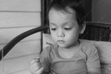 Asian boy about two years old in an orange shirt was sitting on chair.