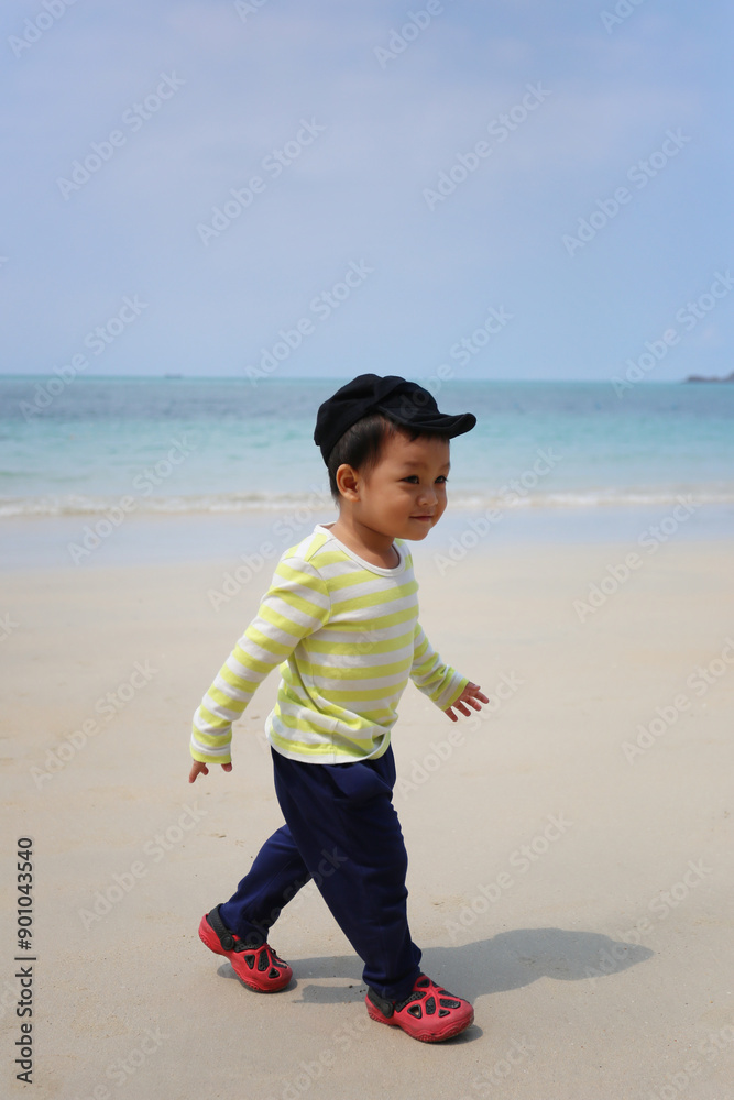 A boy about two years old wearing a long-sleeved shirt, walking on the beach smiling happily.