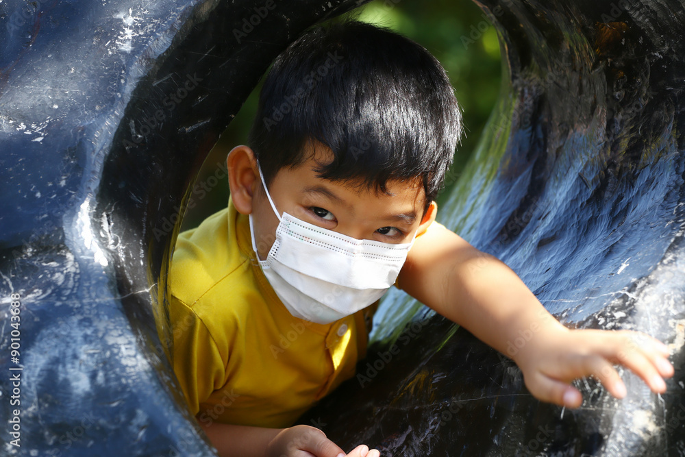 Asian boy about eight years old, in a yellow shirt and wear white face mask.