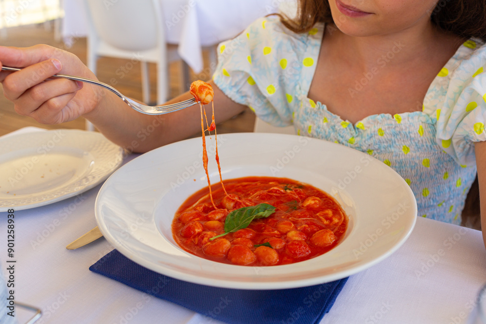 Girl eating potato Gnocchi alla Sorrentina in the south italian restaurant. Is a dish from Campania, Italy prepared with tomato sauce, mozzarella and basil leaves.