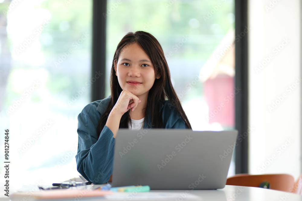 A woman is sitting at a table with a laptop in front of her