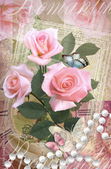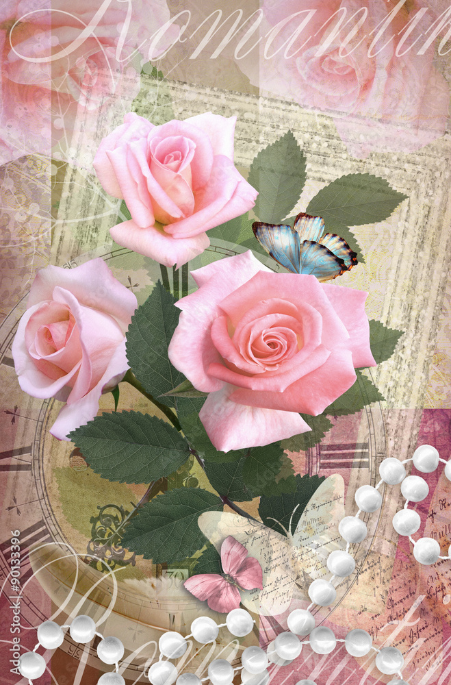 Postcard flower. Romantic beautiful congratulations card design with roses, butterflies and pearl necklace. Can be used as greeting card, invitation for wedding, birthday and other holiday happening.