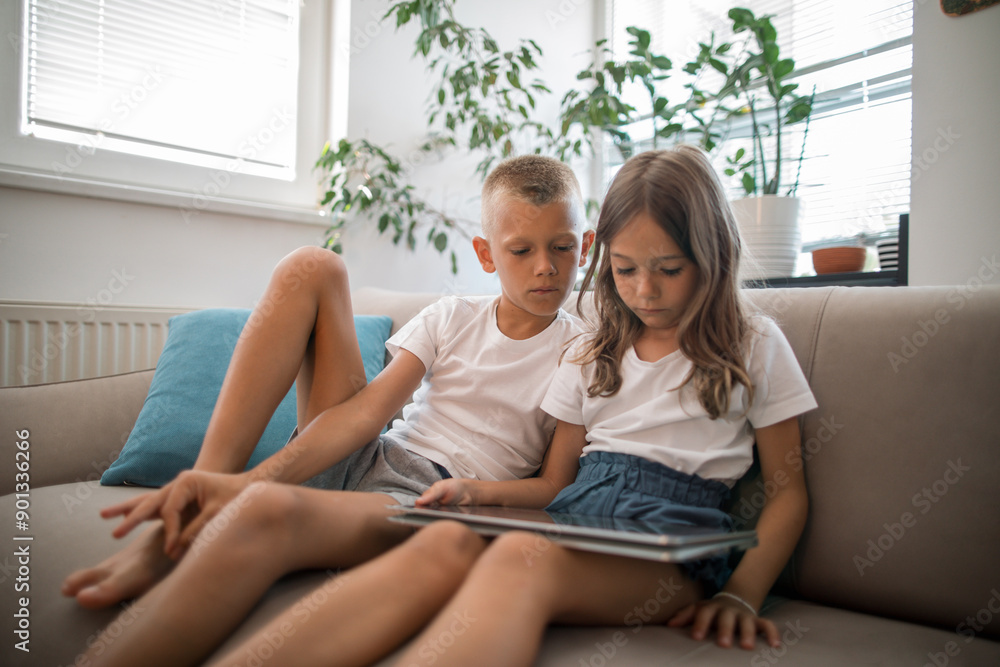 Two children sit on a sofa, engrossed in a laptop