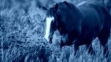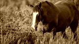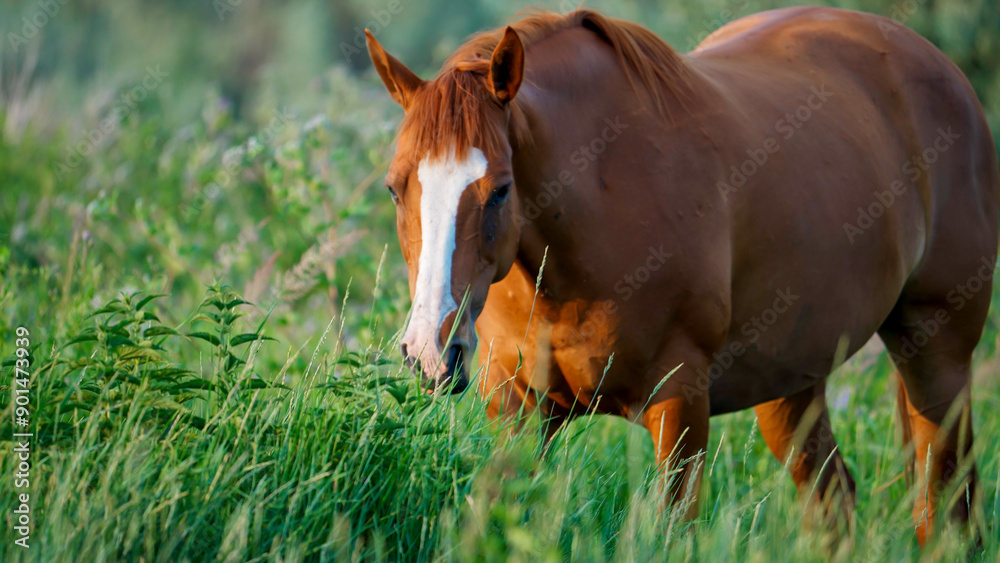 A beautiful chestnut horse with a white blaze on its face grazes peacefully in a lush green meadow.