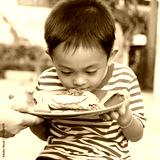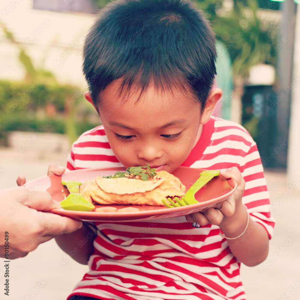 Asian boy sniffing his food