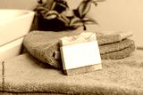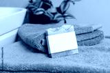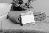 Soap bar with blank label on blue towels near vessel sink and green plant close up, mockup