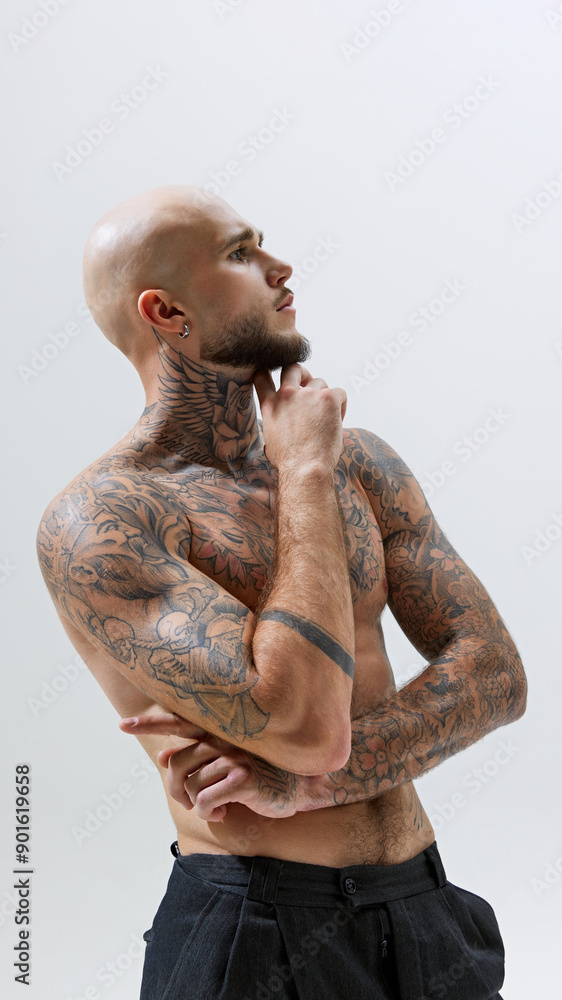 Portrait of handsome young bald guy with tattoos muscular athletic body, posing shirtless in pants isolated on white studio background. Concept of male beauty, body and health care, sport