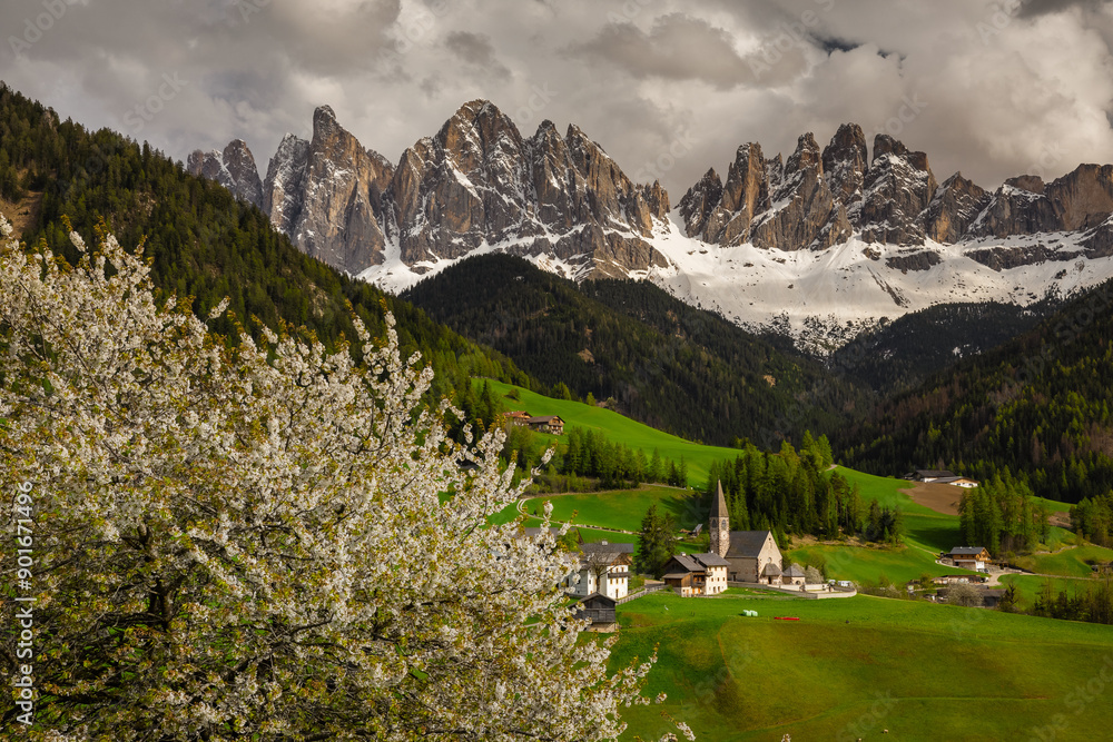 Spring views in Dolomites in Italy. In the picture Santa Maddalena di Funes with Odle mountains.