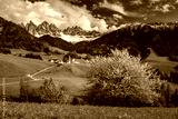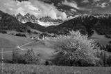 Spring views in Dolomites in Italy. In the picture Santa Maddalena di Funes with Odle mountains.