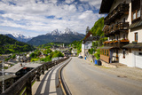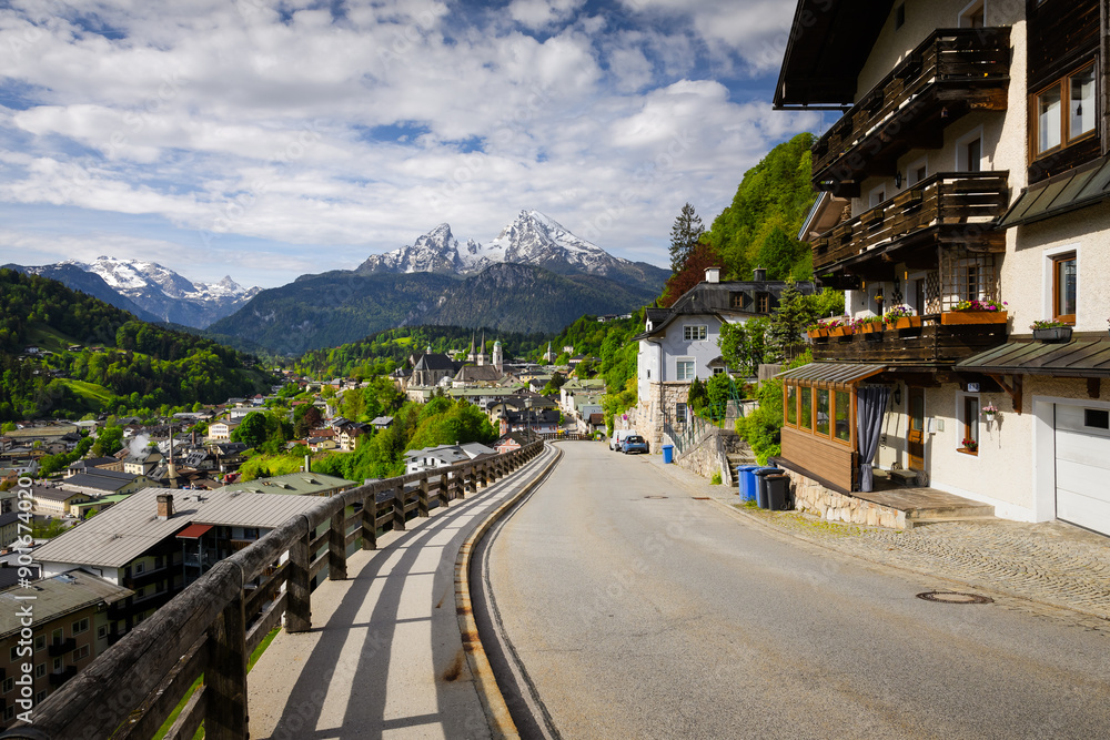City of Berchtesgaden in Bavaria in Germany during spring morning with a view to Mount Watzmann in Alpes.