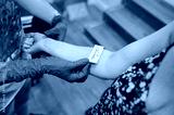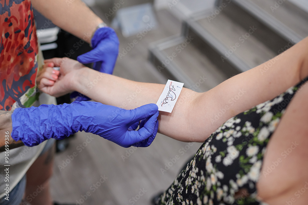 Tattoo preparation. Female tattoo artist wearing blue nitrile gloves preparing to place transfer paper to apply the tattoo sketch to the skin of a woman's forearm