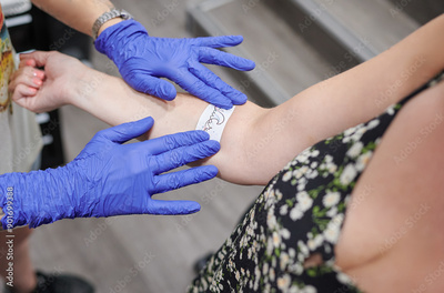 Female tattoo artist wearing blue nitrile gloves pushing to place the transfer paper to apply the tattoo sketch to the skin of a woman's forearm