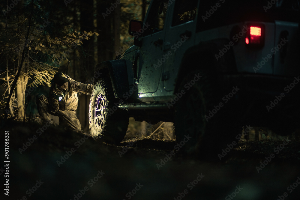 Man Inspecting Tire of AWD Vehicle in Dense Forest During Evening