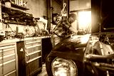 Mechanic Working on Classic Blue Car in Garage Workshop During Daytime
