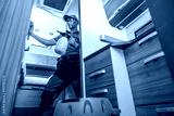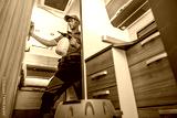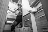 Cleaning an RV Interior by a Person in Orange Outfit With Gloves in Daylight
