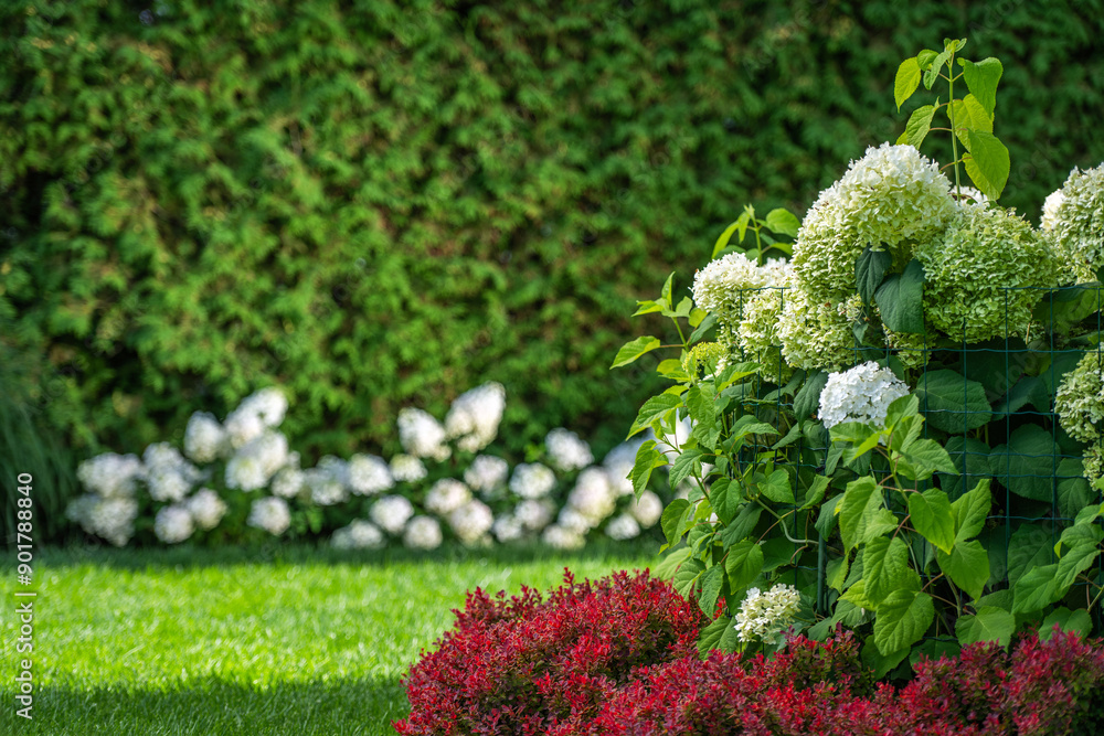 Flourishing Garden With Greenery and Colorful Hydrangeas on a Sunny Day