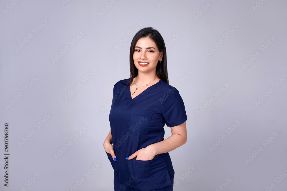 Portrait of a beautiful female doctor in a surgical suit. Medical student. Hospital worker looking at camera and smiling, studio, gray background