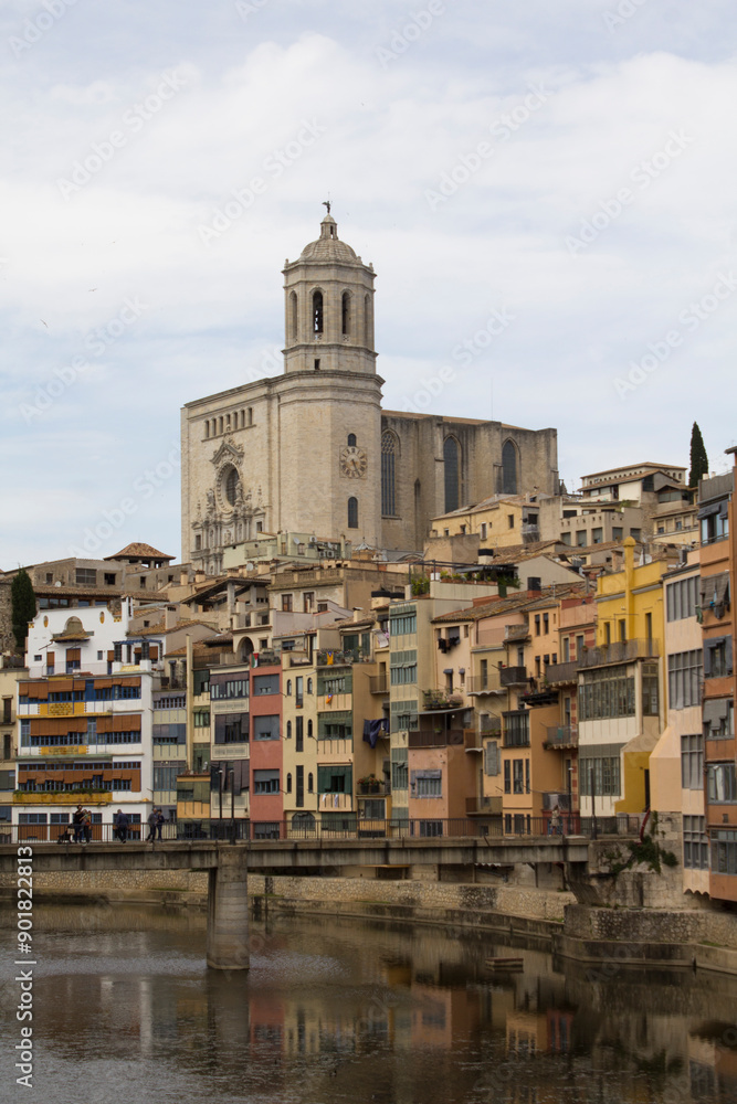 View of the old town and cathedral on a summer day. Location vertical. Gerona. Spain.
