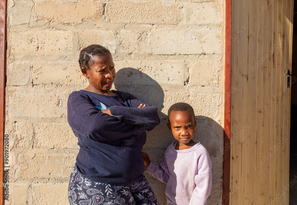 informal settlement, housing crisis, african mother and child in the ghetto in front of the house