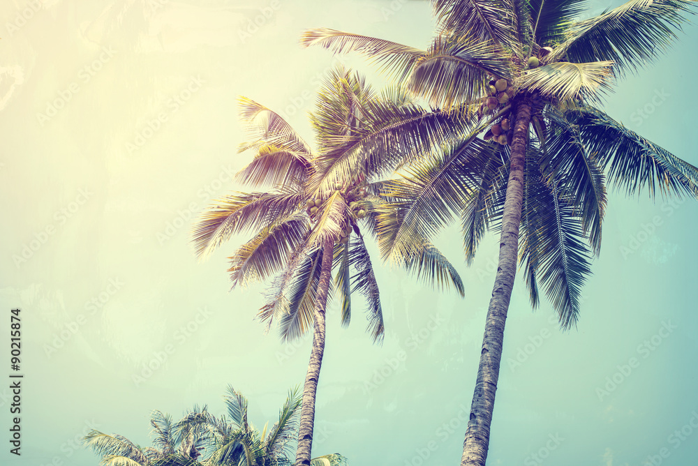 Vintage nature background of coconut palm tree on tropical beach blue sky with sunlight of morning in summer,photo paper texture with instagram filter
