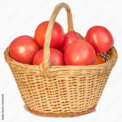 Fresh red tomatoes in a basket on a white background