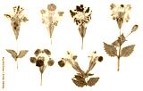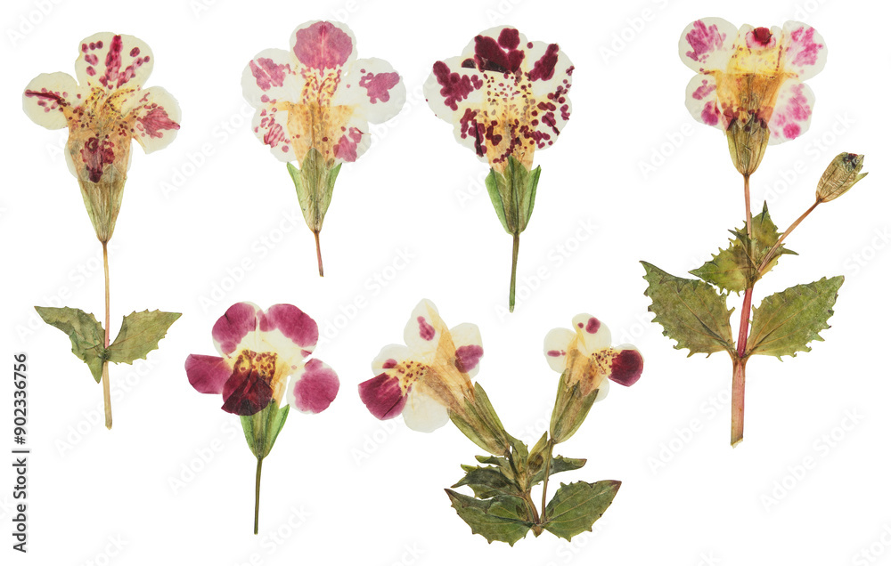Pressed and dried mimulus flowers. Isolated on white background. For use in scrapbooking, floristry or herbarium.