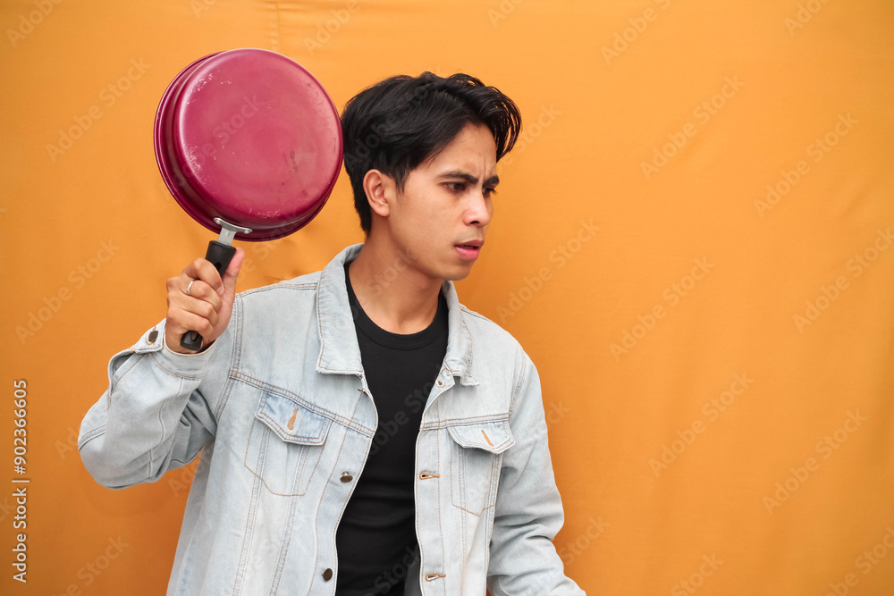 Young Asian man with serious face carrying frying pan like a weapon isolated on yellow background