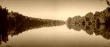 Reflection of trees in the lake. Panoramic view of the banks of the river bay