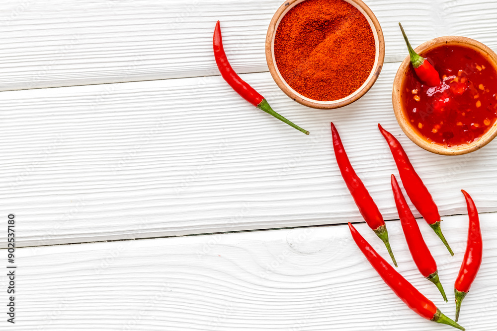 Cooking hot food with chilli pepper on white wooden table background top view copy space
