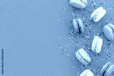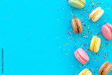 sweet dessert pattern with macarons on blue background flat lay mockup