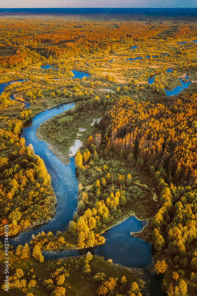 Aerial View Green Forest Woods And River Landscape In Sunny Spring Evening. Top View Of Beautiful European Nature From High Attitude In Summer Season. Drone View. Bird's Eye View