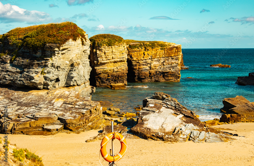 Rocky beach with a lifebuoy, turquoise waters, and lush cliffs under a clear sky