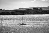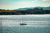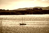 Boat floating on shimmering water with a rocky coastline and distant wind turbines under a clear sky