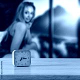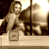 An alarm clock on wooden countertop with copy space. Blurred cozy atmosperic and nostalgic bedroom background with warm evening sublight and a young woman sitting in bed.