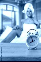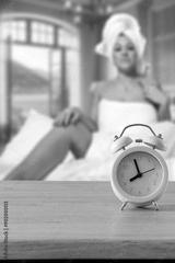 An alarm clock on wooden countertop with copy space. Blurred cozy atmosperic and nostalgic bedroom background with a young woman in bed.